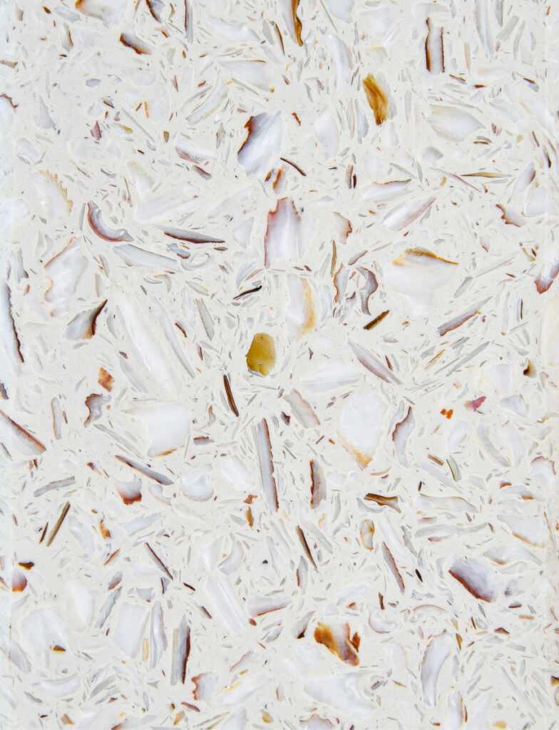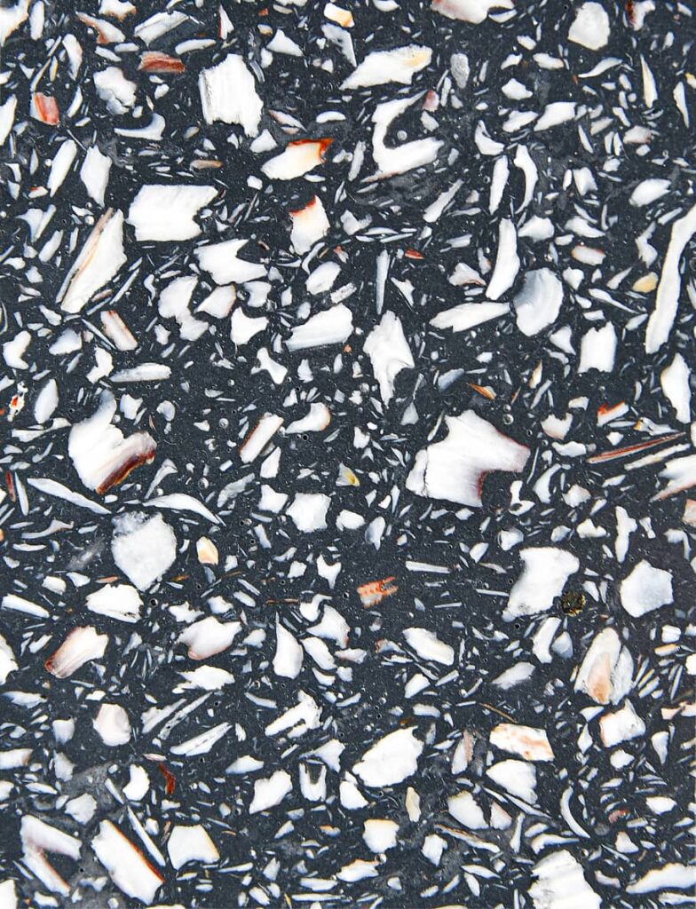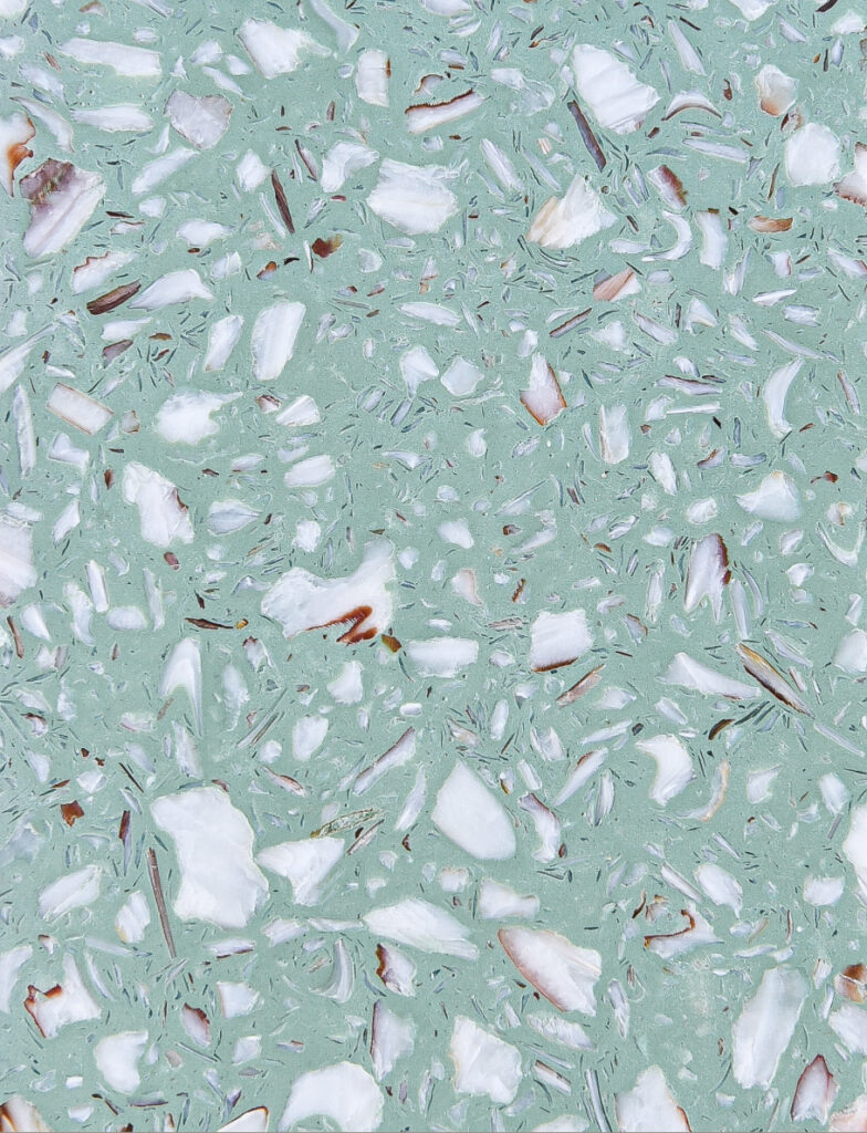 Matériau innovant en coquillages recyclés. Français, performant et bas carbone, il se destine aux sols, plans de travail et au mobilier.