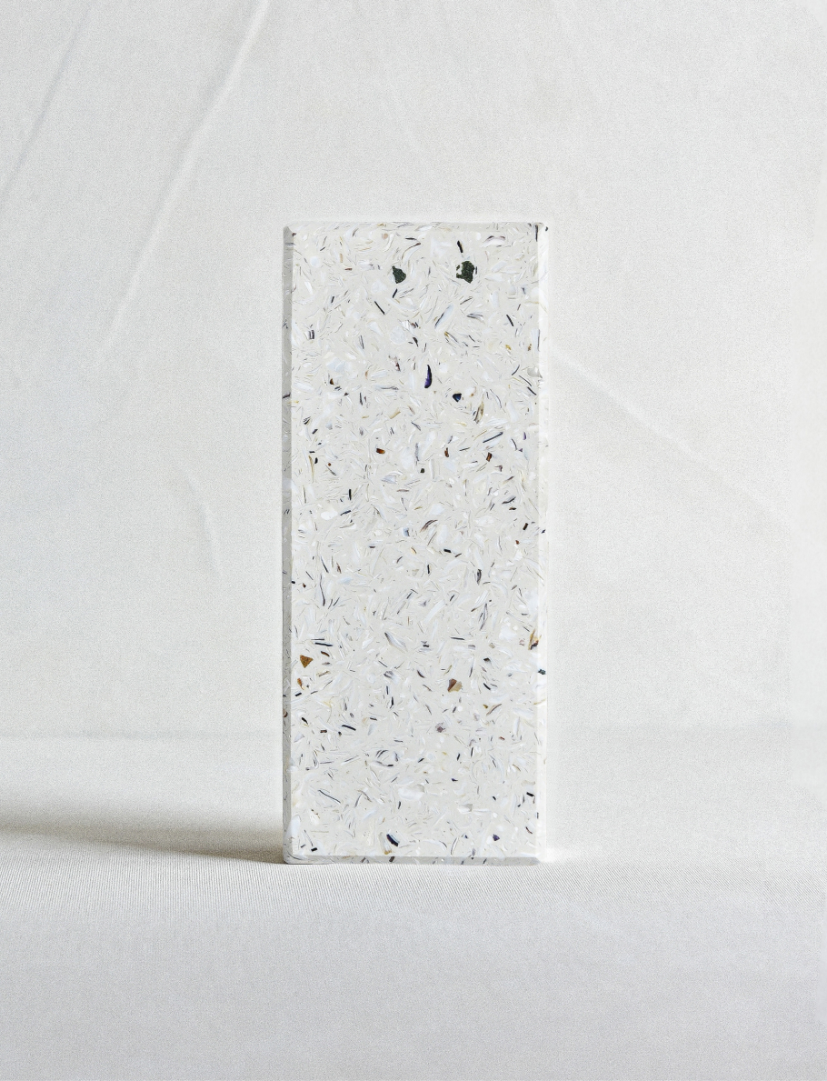 Ostrea Huîtres porte en lui la force brute de la marée. Composée à partir de coquilles d’huîtres recyclées, celles-ci teintent naturellement la matière d’une couleur légèrement grisée. Ses nuances trouvent un écho particulier dans des associations contrastées, notamment avec le noir, qui renforce sa présence, ou avec des éléments métalliques, qui soulignent son caractère brut et structuré.