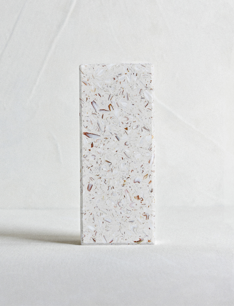 Né du rythme lent des marées et de la mémoire des rivages, Ostrea Saint-Jacques révèle une surface douce et élégante. Sa teinte claire, entre crème et écru, capte la lumière et dialogue avec les nuances marronnées de la coquille. Sa douceur visuelle permet de créer des contrastes chaleureux lorsqu’elle est associée à du bois ou des tons terracotta, en apportant une profondeur chromatique à la composition.